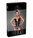 Dit zwarte korset combineert kant en uitdagend wetlook voor een unieke look. Het korset is strapless en heeft een haaksluiting aan de voorkant. De zijkanten zijn gemaakt van doorschijnend, elastisch kant voor een verleidelijke look. De achterkant is voorzien van een wetlook rijgveter die je zelf kunt strikken. De lange jarretels zijn voorzien van clipjes die je makkelijk aan je kousen kunt bevestigen.