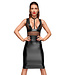 Steel de show in deze opwindende zwarte jurk! De jurk is gemaakt van wetlook materiaal en is voorzien van doorschijnende netstof gedeeltes. Door de nauwsluitende pasvorm komen jouw rondingen volledig tot hun recht en ben je verzekerd van een sexy uitstraling. Aan de achterkant van de jurk zit een rits en een korte split en hij is aan de voorkant voorzien van een verstelbaar, fluweelzacht bandje dat van de hals tot aan het decolleté loopt.