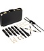 Inhalt: 2 x Handschellen, 2 x Fußfesseln, Halsband, Leine/Spanking-Paddel, Silikon-Ballknebel, 2 x Karabiner, Augenbinde, Kette, Hogtie, Samtbeutel. Artikel aus echtem Rindsleder, Koffer aus PU.