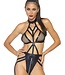 Wetlook cage belt suspender teddy with O-ring halter and zip around string bottom.