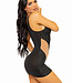 Asymmetrische spandex mini-jurk met transparante delen en strass-accenten.