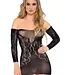 The Off Shoulder Mini Body Stocking Dress is super seductive. The dress is made of finely woven nylon and features floral and dots patterns and a smooth, plain black fabric. The dress fits nice and tight and has a low neckline. The sleeves are attached and give an off-shoulder model.