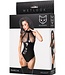 Made of shiny wet-look fabric with sheer mesh inserts at the bust and a harness-style neckline, this bodysuit is perfect for women who want to s