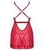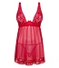 ¡Mira esta tela transparente y detalles de encaje en un rojo vibrante! ¿Lista para una noche apasionada?