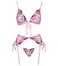 De lingerie set bestaat uit een beugelloze bh, lage string en bijpassende jarretelgordel met een romantisch bloemenborduurwerk uitgevoerd in de kleur roze.