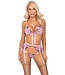 De lingerie set bestaat uit een beugelloze bh, lage string en bijpassende jarretelgordel met een romantisch bloemenborduurwerk uitgevoerd in