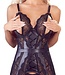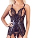 Verleidelijk jarretellehemd van matte stof met 3 verstelbare houders per zijde en spleetcups. Liefdevol afgewerkt en aan de voorzijde voorzien van uitgebreide kantinzetten en decoratieve veters. De ingenaaide tailleband benadruk