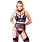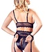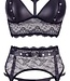 Voor de verleidelijke vrouwen die weten wat ze willen, is er dit elegante jarretelsetje met geknoopte cups en verstelbare bandjes bij de hals en de nek. De riem voegt een decoratief element toe aan de voorkant. Het heeft afneembare handboeien met klittenband op de rug en een mooie collar die de BDSM outfit compleet maakt. Inclusief slipje met doorlopende drukknopen. De set is gemaakt van classy bloemenkant gecombineerd met studs die een gedurfde look creëren.