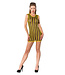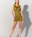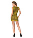 En slående miniklänning från Guilty Pleasure-kollektionen med breda gula latexränder tryckta på..